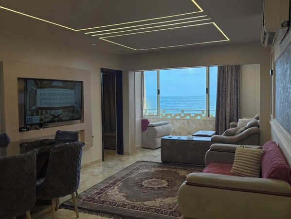 Majoituspaikan Beautiful direct sea view 3-bedroom renovated Chalet Maamoura beach Alexandria kaikkien huoneiden mukavuuksiin ja palveluihin kuuluvat esimerkiksi ilmastointi ja internetyhteys.