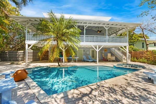 Toiminta tapahtuu ulkopuolella lämmitettyllä uima-altaalla, suurella kannen ympärillä ja yksityisellä telakalla. Voit nauttia hehkuva auringonnoususta ja auringonlaskuista joka päivä, trooppisen tuulen ja jos olet onnekas --- delfiinien ja manaattien havainnot. Jos kausi on oikea, sinun ei tarvitse etsiä kauan rapuja, pistoäteitä ja valtavaa snook-uintia vapaasti heti laituriltasi! Kukkivien viiniköynnösten ja kämmenrintamien keskellä on kuohuviini-allas. Lämmitetty runsaalla nojatuoleilla. Tarvitsetko tauon aurinkoon? Siirry varjoon pingipongin, foos-pallo tai viileän ulkopuolen baarissa. Suuri ruokapöytä, jossa on kahdeksan tuolia, mukava sohva ja kaksinkertainen rokkari sekä grilli, tekevät viihdyttävästä ulkoilmasta cinchin. Etukuisti on kaikki Floridan istutus-tyylistä kuistilla keinulla ja kahdella vanhanaikaisella keinutuolilla.