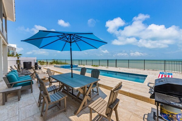 Step outside and you’ll find your own private oasis: a heated pool and bubbling hot tub overlooking a stretch of sandy shoreline. It’s the ideal spot for morning coffee dips or evening soaks under the stars, all while listening to gentle waves lapping at the shore. The seamless indoor-outdoor flow invites you to lounge, grill, and make memories with family and friends in a setting that feels both intimate and expansive.