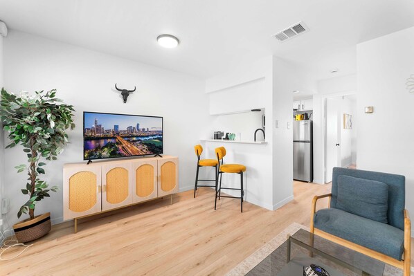 - 50” smart TV in living room with complimentary access to live cable (YouTubeTV), Disney+, Amazon Prime Video, HBO Max, Hulu, and ESPN+ for all your binge-watching needs