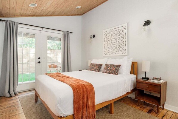 Bedroom/Bathrooms Home: Bedroom 1: Queen size bed with luxury linens, work desk, Smart TV, and relaxing décor. Home: Bedroom 2: Queen size bed with soft bedding, closet space, and access to shared full bathroom with shower/tub combo. Casita: Bedroom 1: Queen size bed with modern furnishings, Smart TV, and private full bathroom with glass shower.