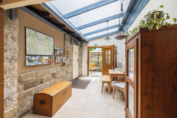 Sisäänkäynnin alueella on mukava yhteinen huone viherhuoneessa. Wi-Fi sisältyy hintaan.