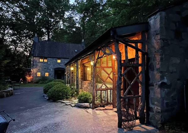 Rustic covered porch, perfect for morning coffee.