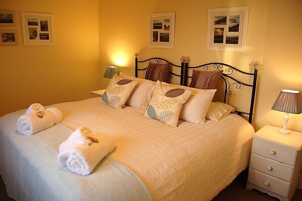 The main bedroom has stunning sea views, original cast iron fireplace, 1 king-size bed, which can be detached to make 2 singles (we have gorgeous designer bedding for both options), tall 5 drawer chest of drawers, 2 bedside tables and coat racks for hanging garments.