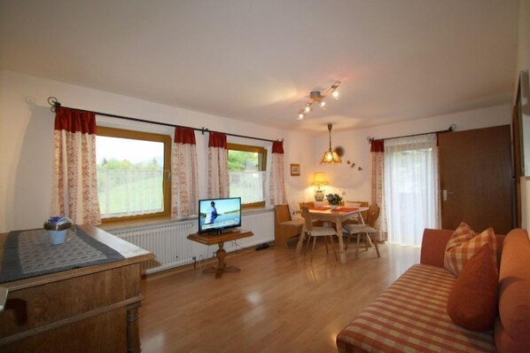 Nauti puhtaasta auringonpaisteesta aamusta iltaan olohuoneessa upealla lounaisvalotuksella. Voit odottaa Berchtesgadenin Alppien taustoa Untersbergistä ja Predigtstuhlista pohjoiseen Hochstaufenliin. Parveke: länteen! Nauti auringonlaskusta viihtyisällä lasillisella talon juomalla lepotuolissa. Keittiö on pieni, mutta riittävä ja varustettu kaikella, mitä tarvitset päivittäisiin tarpeisiin. Kaikki muu on onnellinen toteutettu, jos mahdollista. Makuuhuoneessa aamu aurinko herättä�� sinut parivuode. Käsipyyhkeet. Varustus: olohuone - TV, satelliitti, radio, keittiö: kahvinkeitin, vedenkeitin, leivänpaahdin, liesi. Olohuoneessa on seinäsänky kolmannelle Henkilö. Makuuhuone: sängyt on tehty, lisävarustus: lasten matkasänky, kylpyhuone: käsipyyhkeet ja suihku. Ilmainen WiFi. Mukava, rauhallinen ja valoisa huoneisto parvekkeella, kalustettu maalaistyyliin.