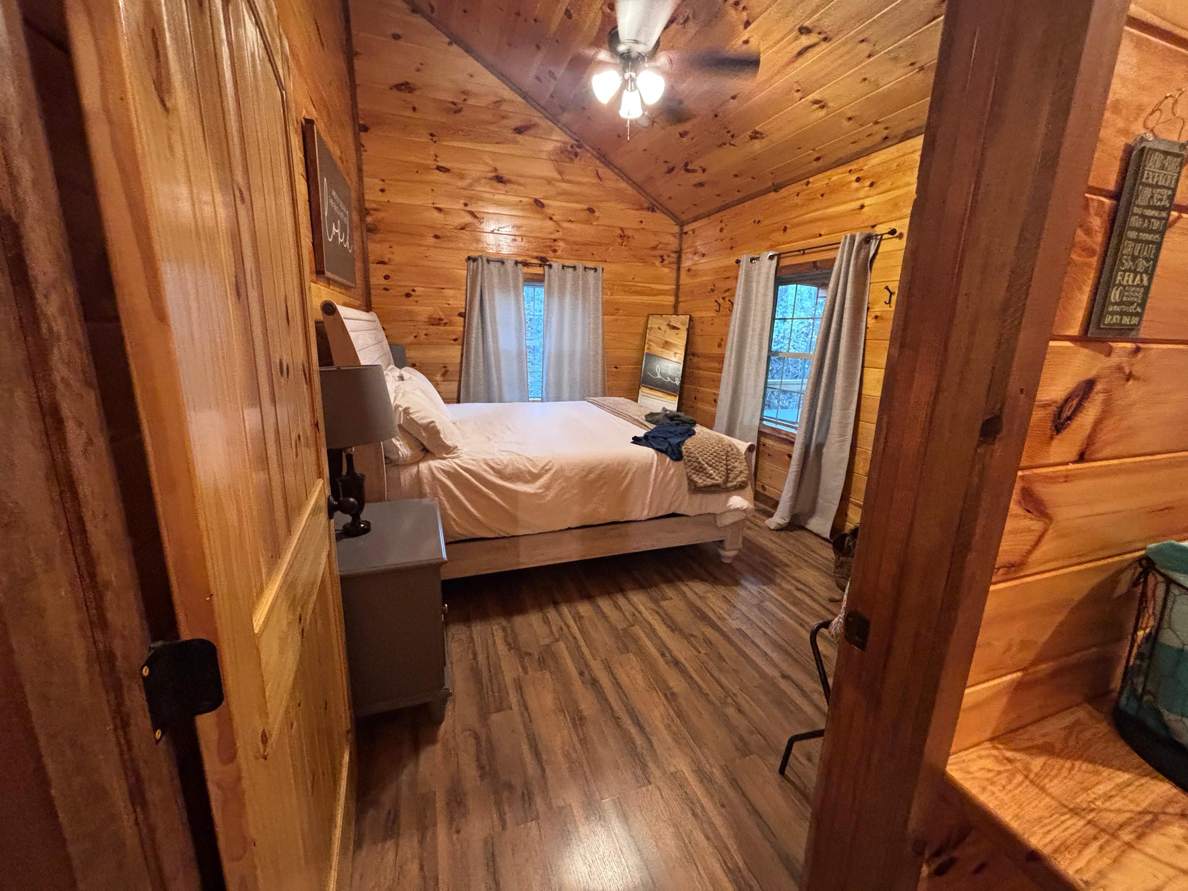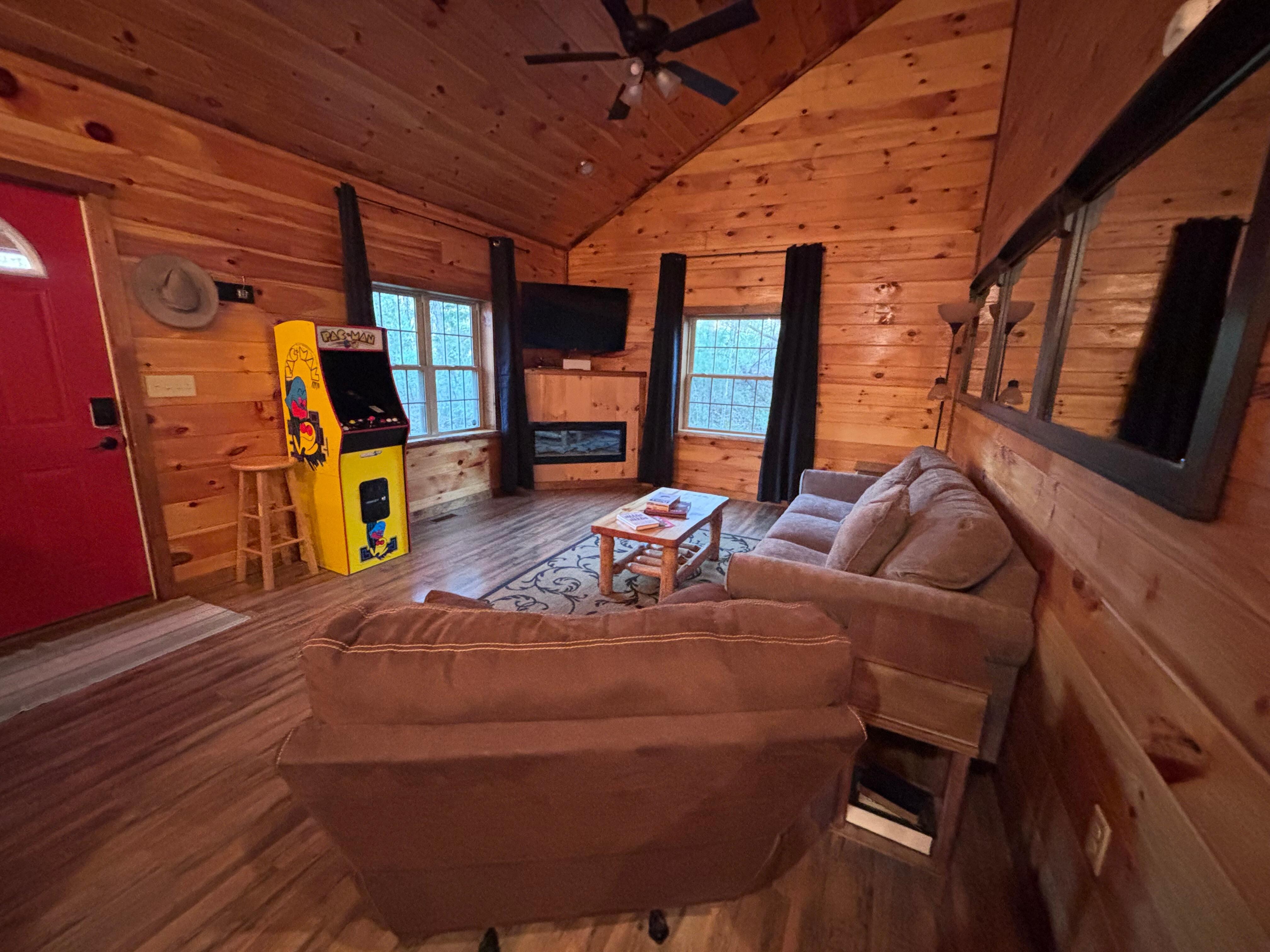 Nestled amidst the lush woods of Red River Gorge, The Little Red Cabin is a modern escape offering the comfort of home with the thrill of outdoor adventures right at your doorstep. Step inside to a warm, wood-paneled interior featuring a plush king-sized bed for restful nights and an inviting living space complete with high-speed Wi-Fi, a smart TV, and nostalgic arcade gaming. The kitchen is fully equipped to cater to your culinary whims, while the electric fireplace adds a cozy ambiance for intimate evenings.
