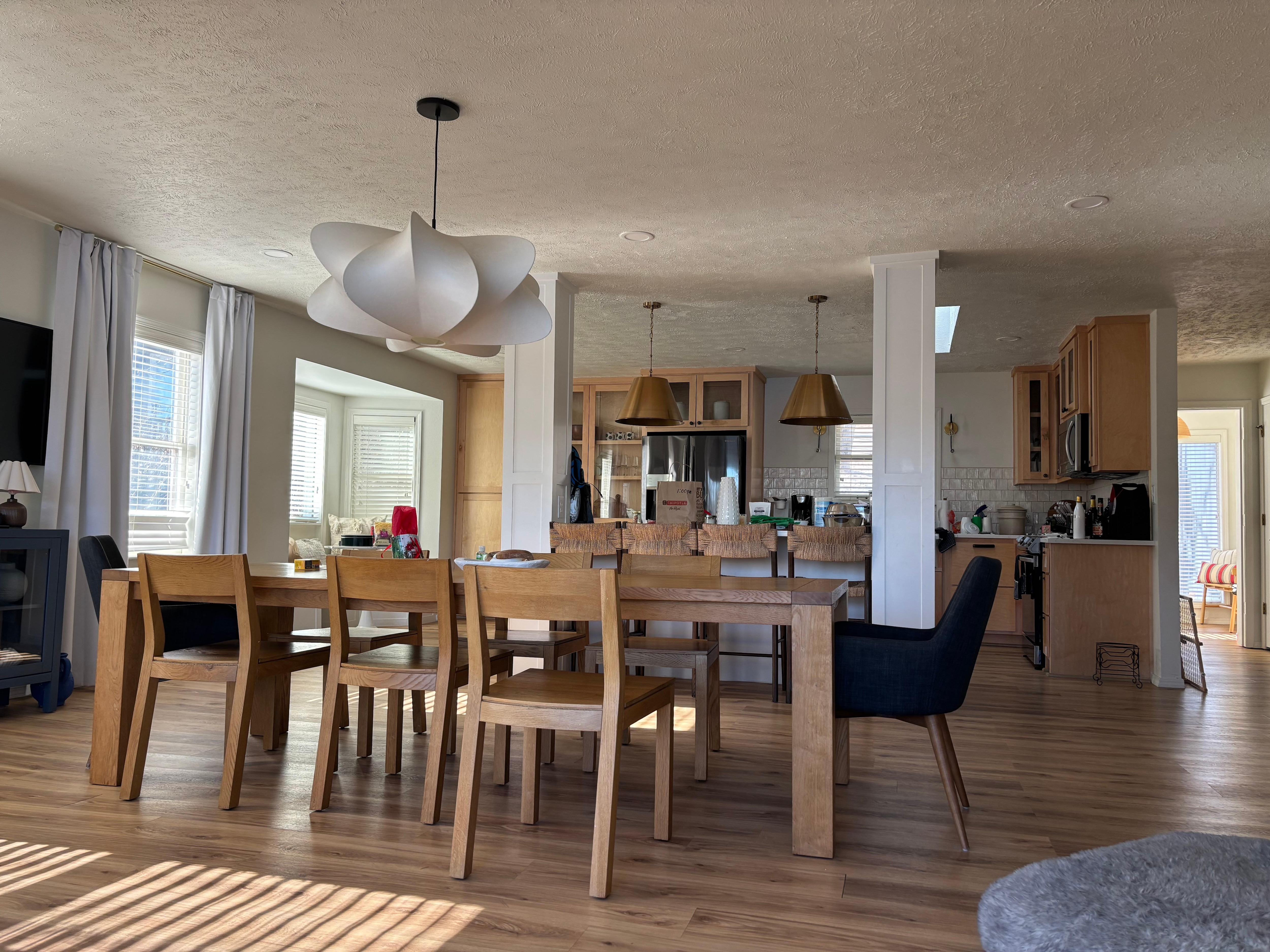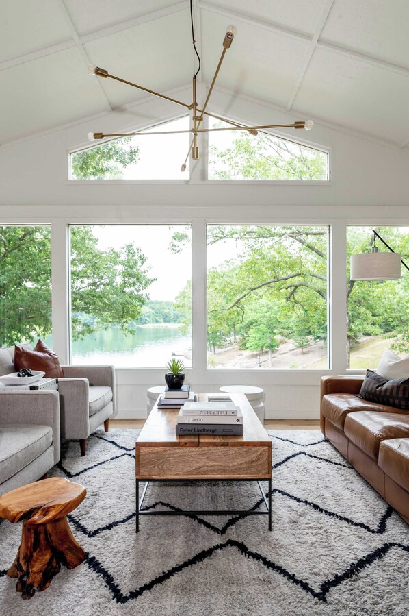 When you first enter our home, you'll be greeted by the large windows with a view and our cozy living room with seating, a Smart TV, and a fireplace. In this open concept space, you'll also find a dining table for 8 and our fully stocked kitchen!