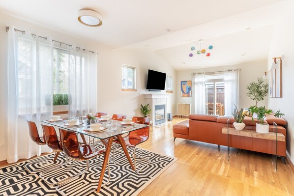 and inviting. The kitchen, dining room, and living room all flow together to