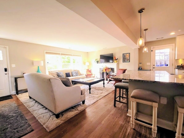 Settle into a bright, open-concept living room designed for connection. Enjoy streaming your favorite shows on the smart TV or simply relax by the fireplace with a good book. Large windows fill the space with natural light, making it an inviting spot morning to night.