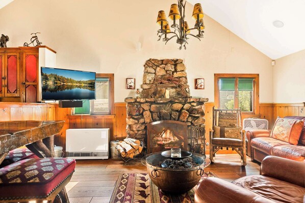 The inside of the home is just as impressive with wood features and accents throughout, immersing you in a rich cabin atmosphere. The open floor plan organically blends spaces together while remaining separate enough for everyone to spread out and find their own personal spot. A comfortable living room offers a leather sofa and armchair seating along with a wood rocking chair. A mounted smart TV provides an additional form of entertainment during needed downtime after a day filled with local activities. The focal point of the space, however, is the stunning gas fireplace. Gather around the fire for a cozy movie night.