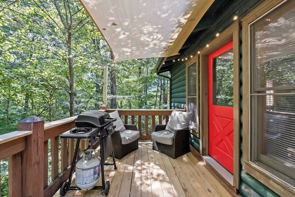 Guests will have access to the entire cabin, including the bedroom, full bathroom, and the shared game room located below the living space. The game room features a ping pong table, foosball, darts, board games, a TV, and a comfortable couch. Enjoy the outdoor seating on the patio or balcony, and utilize the BBQ grill for outdoor cooking. The property also includes a garden or backyard. Please note that the rec room is shared between guests at the Big Smoky cabin.