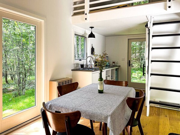 The main floor includes a cozy sitting area, kitchen, dining table, and wet room. Climb the ladder to a lofted bedroom with a cushy mattress and peaceful treetop views. Three sliding glass doors open to the sights and sounds of summer in the Catskills.