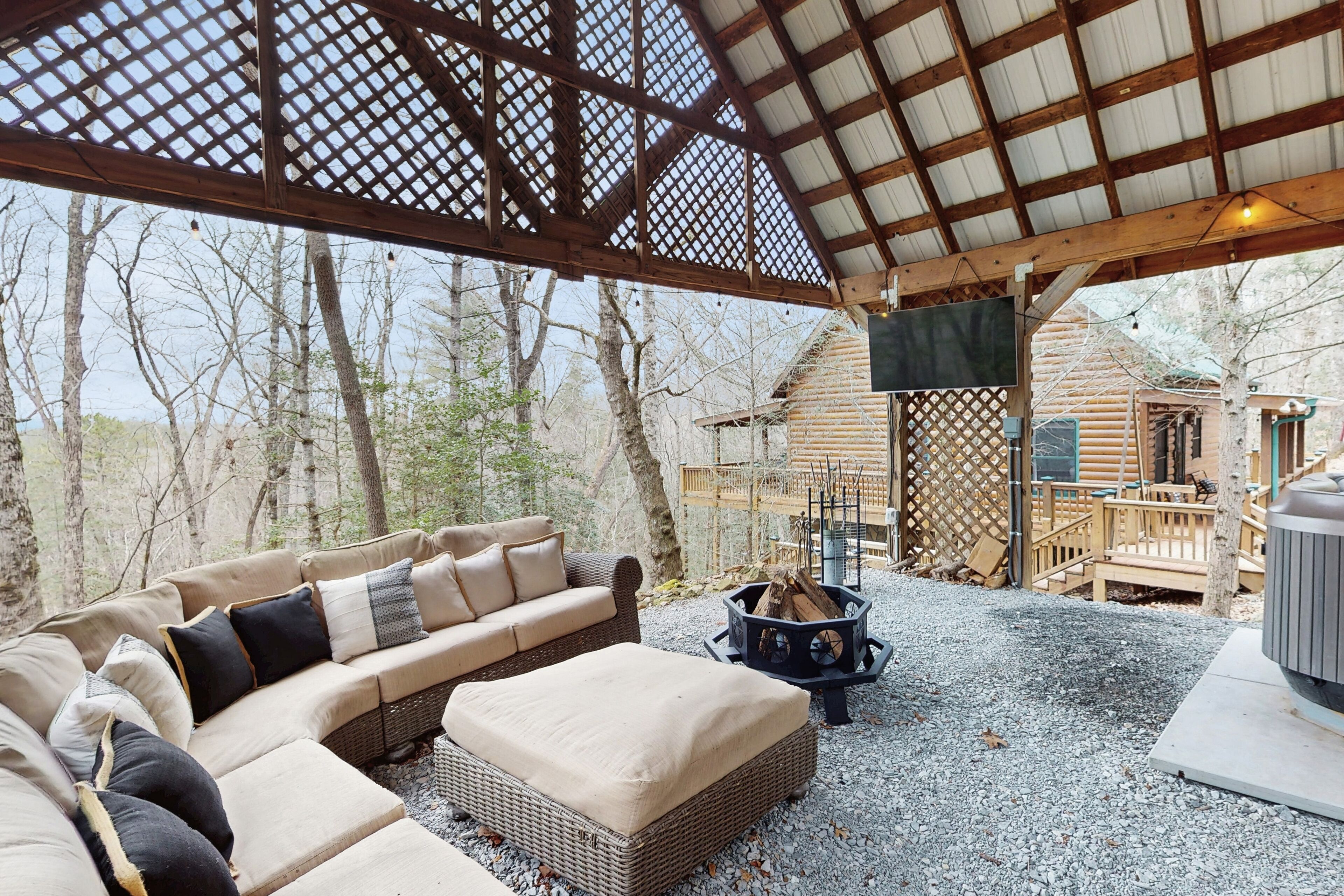This property is equipped with exterior security camera overlooking the driveway/parking and shed area only. It does not have a view of any interior spaces or hot tub