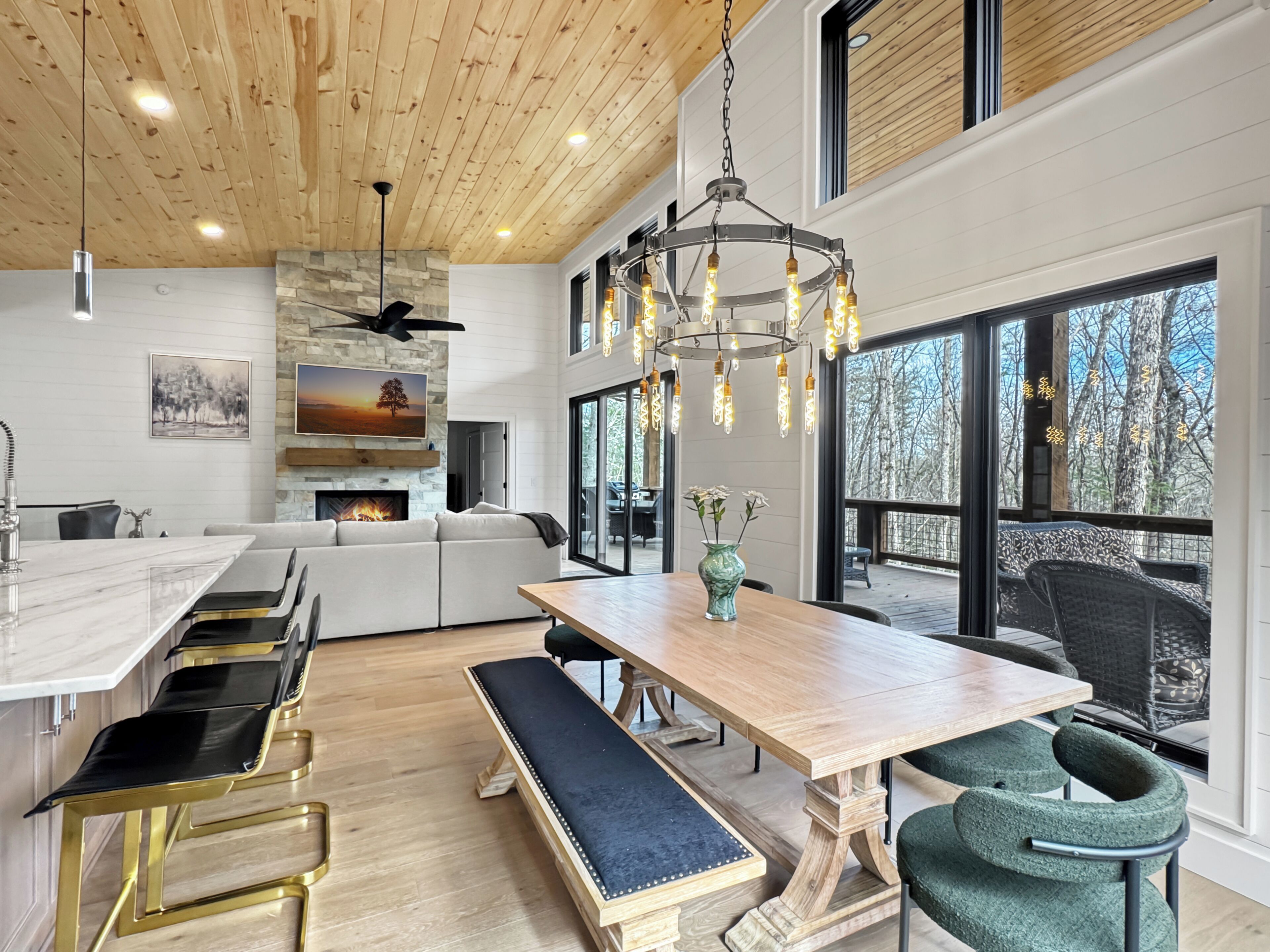 Step inside this luxury cabin rental in Blue Ridge and notice the attention to detail in every corner of this spectacular property. The main living area features soaring cathedral ceilings that create an open and airy feel. A dual-sided wood-burning fireplace serves as the focal point, providing warmth and ambiance to both the large living room and dining area. Gather together to play some family games or watch a new release movies on Netflix. Being a pet-friendly cabin, your furry family member can also enjoy some quality time with the gang. The luxurious furnishings and decor add to the cabin's charm, ensuring that every moment spent indoors is comfortable and memorable. For some additional space, head down to the lower level where you will find another large fireplace, TV and plenty of seating, plus deck access to that amazing creek-front setting plus plenty of seating for everyone!