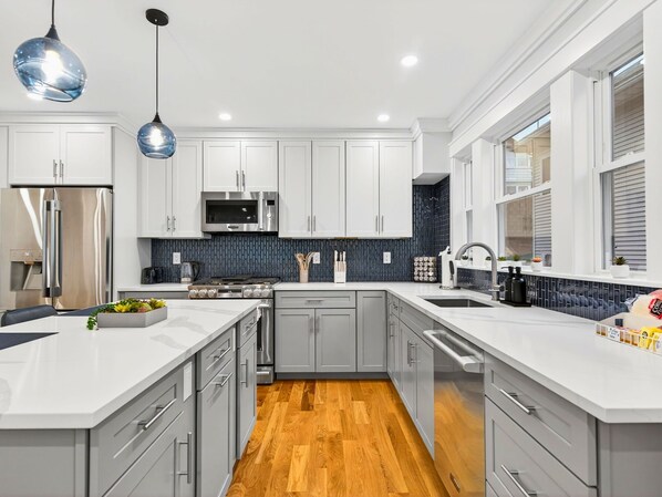 This light-filled 4 bedroom home features high-end finishes throughout: hardwood floors, chef’s kitchen with stainless steel appliances and quartz counters, curated furnishings, and thoughtful touches that make staying here effortless. The open living and dining area is ideal for gatherings, streaming movies, or remote work (fast Wi-Fi and a dedicated workspace available). The downstairs family room is perfect for kiddos and adults alike. Four full baths keep mornings smooth for larger groups and families with children.