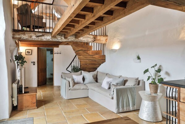 Ascend the stunning oak staircase to the glass balcony, where the master bedroom awaits. To the left, you'll find a sumptuous super king bed, promising restful nights. At the other end of the balcony, there's a freestanding copper and nickel bath. Downstairs is a double sofa bed, offering additional sleeping space or a serene spot to relax. If you would like to use the sofa bed, please let us know in advance so we can prepare it for you. There is a charge of £30 per night for additional guests using the sofa bed.