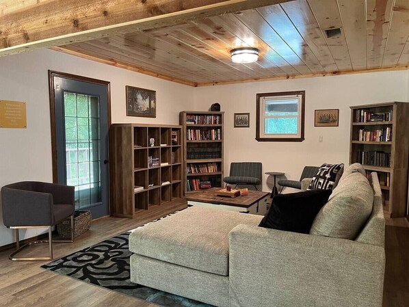 The living space is a luxurious, leather and wood open-concept design that affords comfortable and easy living during your stay at Soho Loft. All the furniture is sophisticated and comfortable. From the sofa, you can enjoy watching the 55” smart TV and take in the warm, soft, orange glow of the see-through gas log fireplace or just kick back and enjoy a drink and relaxing conversation. If your mood changes, bring your drinks and move to the seating area of the large backyard-covered deck or listen to the sounds of nature while you relax on the extended sun deck in the fully reclining lounge chairs. If you need to do a little catching up on your weekly correspondence or touch base with family and friends, Soho Loft offers a separate office space for you to comfortably do just that.