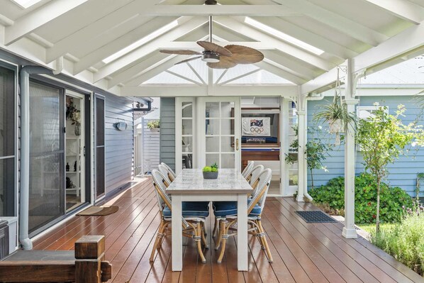 With its outdoor kitchen and dining area, it feels like stepping into a five-star resort. Fire up the barbecue, unwind in the spa, lounge on the daybed, or enjoy your favorite shows on the outdoor TV. For those looking for a little friendly rivalry, the separate games room, complete with a sleek pool table, promises endless entertainment for family and friends.