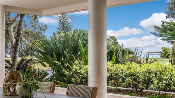 Outdoor: Apartment 2 Surfside celebrates it's stunning Clarke's Beach location with 2 sunny outdoor spaces, perfect for entertaining and relaxing. The front patio is accessed from the indoor living area and boasts stunning ocean views - dine alfresco at the 8-seat table and chairs, sharing a BBQ with those you love. A generous rear patio is also fitted with outdoor dining and can be accessed from the master bedroom.