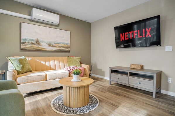 Guests enjoy new ductless air conditioning, high-speed internet, and a 55” Smart TV for streaming. An assigned heated underground parking stall is included, along with easy access to nearby river pathways and green spaces.
