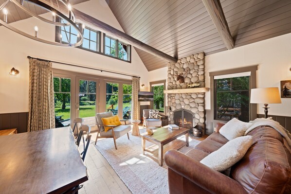 Step onto the back porch to enjoy breathtaking river views and vibrant foliage, or gather in the inviting living area where a plush sofa and armchairs surround a stone fireplace—perfect for cozy evenings with a book, a movie, or quality time with friends and family.
