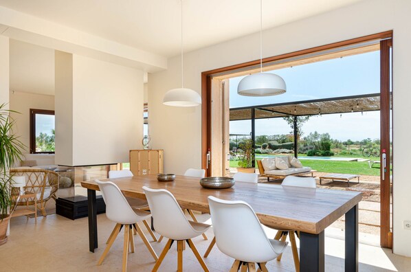 The interior of the villa is very bright, with high-quality finishes, including air conditioning, underfloor heating, Wi-Fi, and satellite TV. The spacious living room with a large sofa offers unobstructed views of the garden and pool. Adjacent is the kitchen with an island and stove, a dining area, and all the utensils needed to prepare your favorite dishes.