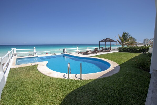 Al entrar a la villa: sala, komedoeri, área de juegos, sala-televisio täysin varusteltu, baari, kokina kokonaan toiminnallinen, 6 tapaa täydellisenä kahvin tapaksi ja sohvakamaksi, piscina infinita, jardín con solarium, tumbonas, mesa y acceso directo a la playa.