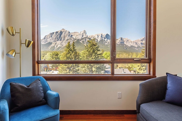 Welcome to our elevated mountain retreat, where breathtaking views of the Three Sisters, Ha Ling, and Rundle Ranges surround you from every window. This stylish 2-bedroom, 2-bathroom condo blends cozy alpine charm with modern comfort.