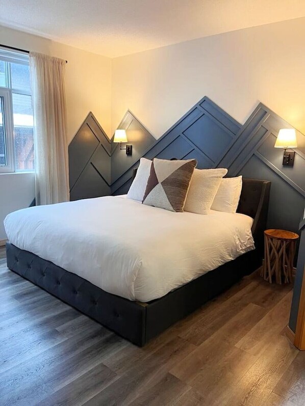 This unit is newly renovated and showcases the Beautiful Rocky Mountains. Spacious 2 bedroom (King & Queen beds) and 2 bathroom. Comfortably sleeps 4 with a pull-out couch that sleeps an extra 2. River Rock Fireplace (electric) & AC. Walking distance to downtown (Location!) & 10–15-minute drive to Banff. Underground parking (1 stall). Master bedroom includes a Jacuzzi Tub.