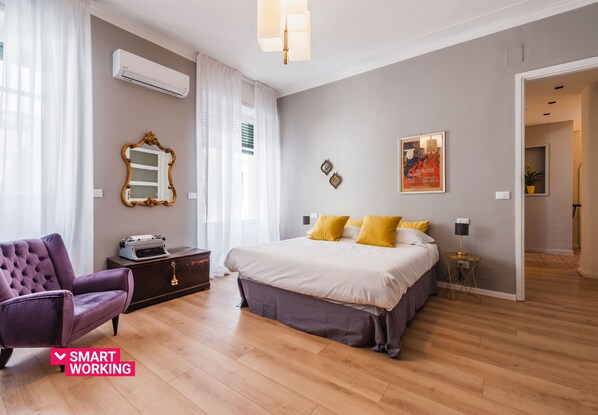 The four bedrooms, equipped with balcony, are large and spacious, air-conditioned, furnished with queen-size bed, closets and antique furniture. Two bathrooms with shower and a toilet, all with bidet, washbasin, bathroom linen, hairdryer and electric fan heater, complete the layout.
