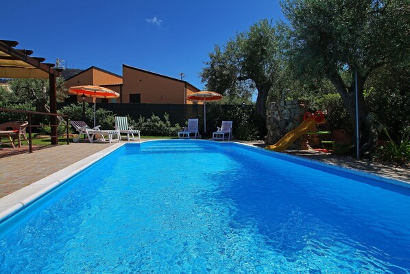 Allas on talon vieressä, ja siinä on aurinkotuoleja, aurinkovarjoja, ulkosuihku ja mukava patio, viileä paikka, jossa voit nauttia lasillisen viiniä!