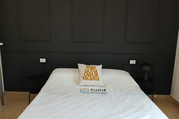Description: comfortable apartment with brand new furnishings on the second floor of a small building. Entrance to living room with table, sofa, equipped kitchen and balcony with washing machine - large bedroom with double bed, single bed and single bed pouf, elegant boiserie and balcony - complete bathroom with shower. Air conditioning in the living area. Smart TV and wi-fi. Convenient shared garden.
