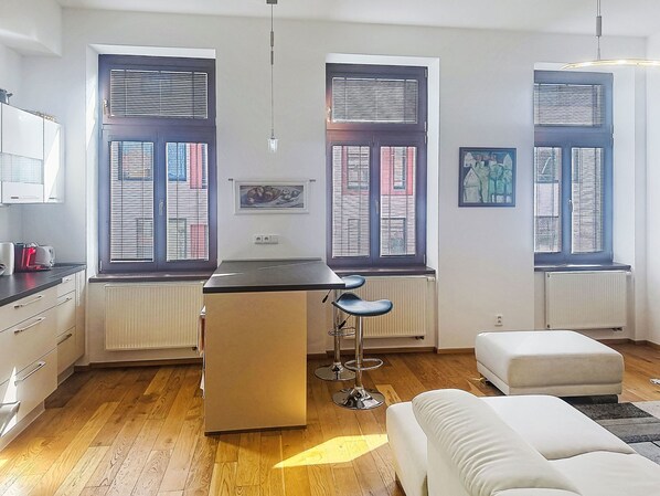 "Budweis Center View", 2-huoneen huoneisto, 56 m2, 1. kerroksessa. Kohde soveltuu 2 aikuiselle + 1 lapselle. Peruskorjattu vuonna 2024: olohuone, TV. 1 huone, 1 parisänky. Keittiönurkkaus (uuni, 4 induktioliesi, leivänpaahdin, vedenkeitin, kahvinkeitin). Suihku/WC. Kaasulämmitys. Kaunis näkymä kaupunki. Käytettävissä: pesukone. Internet ( Langaton LAN [WLAN] , ilmainen). Pysäköintipaikka. Huomioitavaa: savuton huoneisto. Enintään 1 lemmikki/koira sallittu. Palosammutin, ei hissiä.