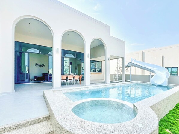Suuri 3 Bed Beach Villa näkymät uima-altaalle, jossa oma spa. Täydellinen perheille