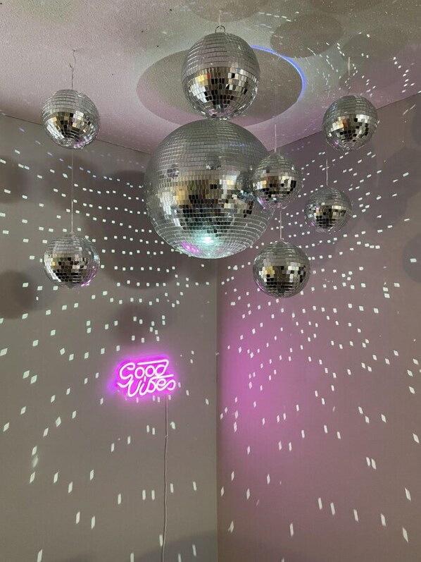 Welcome to the Disco Den, where every stay promises to let the good times roll! Step into this funky 1-bedroom apartment located just two blocks from downtown Champaign. With multiple disco balls casting glittering reflections and ambient lighting setting the mood, you`ll feel like you`ve stepped back in time to the heyday of disco. Whether you`re here to boogie the night away or simply soak in the retro ambiance, the Disco Den invites you to let loose and make memories.