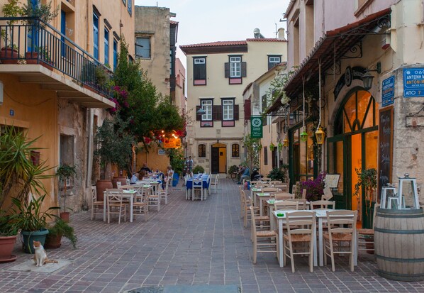 Plateia Rouga on eloisa ja viehättävä pieni piha, joka sijaitsee paikallisten vanhankaupungin osan sydämessä. Tämä alue, aivan Agora-kaupunginosan peittämien markkinoiden takana, on aito osa vanhaa kaupunkia ja vain muutaman minuutin päässä kauniista innostavista kävelyretkistä Hanian ikonisella venetsialaissatamalla. Sitä ympäröivät herkulliset ja luovat ravintolat ja tavernat, ja sitä ympäröivillä mukulakivikatuilla kävelykaduilla löytyy kahviloita, baareja ja yöelämää kaiken ikäisille ja gustolle.