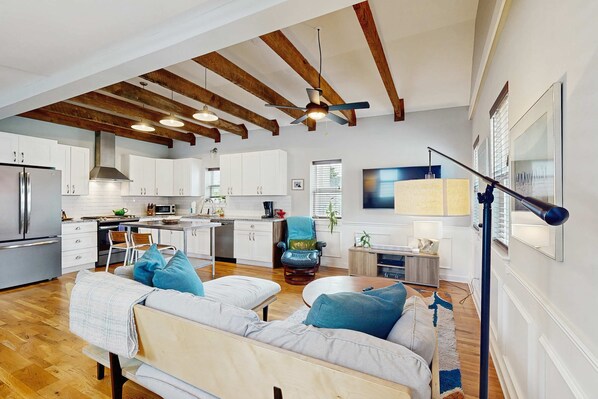 High times in the Lowcountry await at this gorgeous cottage, boasting a sleek interior, private deck, and a prime location within a short stroll to dining and entertainment. Step inside to find hardwood floors, modern furnishings and finishes, stainless steel appliances in the fully equipped kitchen, and smart TVs throughout. The classic Nintendo is sure to beckon your inner child.