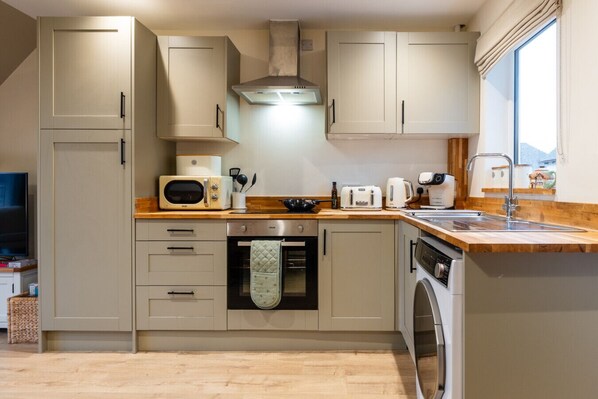 Inside, you’ll find an open-plan kitchen and living room designed for relaxing after days out exploring. The comfortable seating area includes a double sofa bed for additional guests. Upstairs, the home offers two inviting bedrooms, one with a double bed and a second with a single, alongside a modern family bathroom.