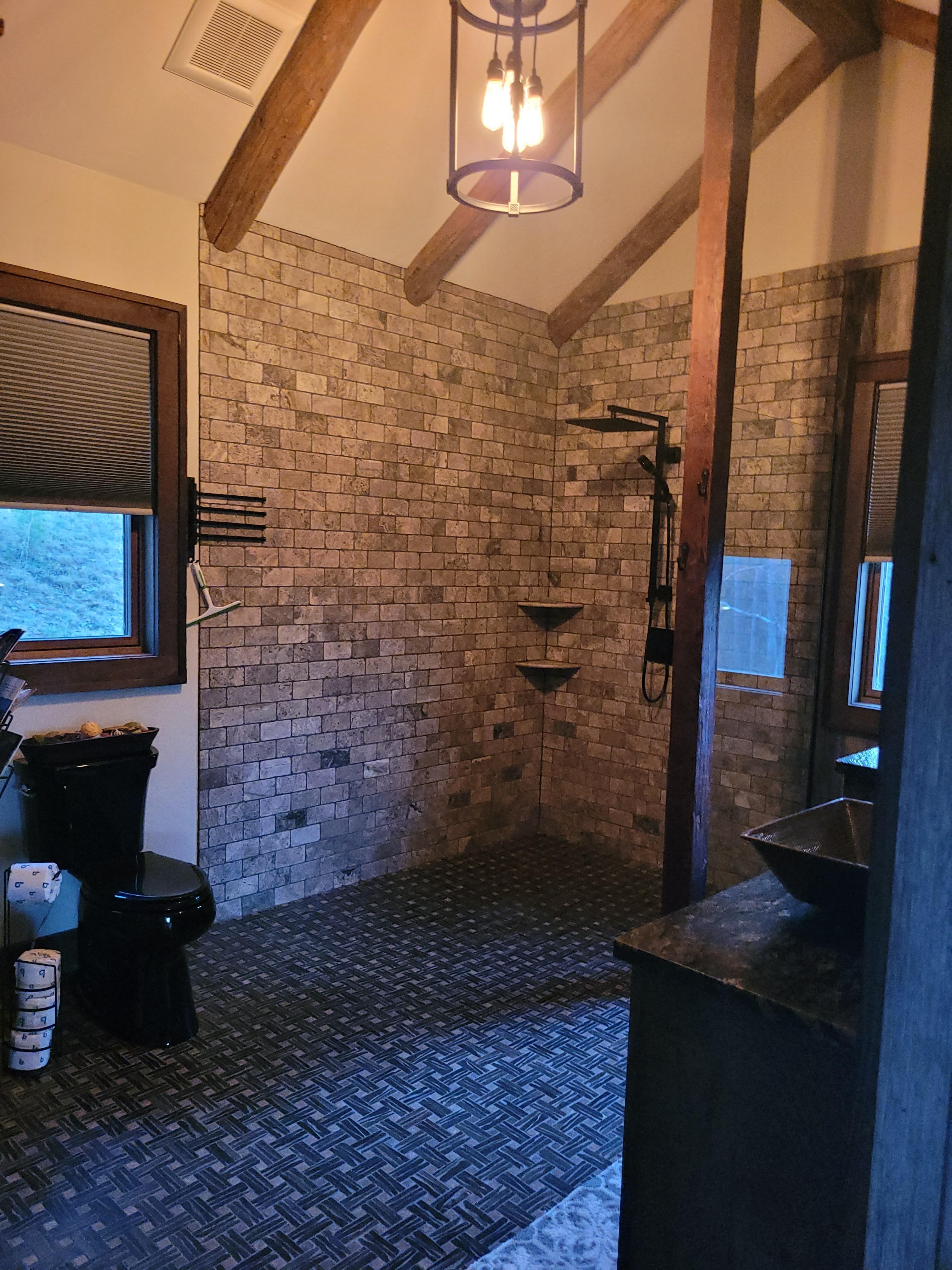 This property takes shape after a lifetime of finding old barns and log cabins that were destined to be torn down or even left to rot away. Through the years we have carefully dismantled these structures and saved every usable item we could to try to create something special to us..... and hopefully special to our guests as well. From the antique hewn logs to the reclaimed locust porch posts, rails, and decking this is a uniquely different log cabin that you will have a hard time finding anything comparable. Step inside and feel the antique solid oak hand scraped barn wood flooring under your feet. Enjoy the warm feel of the solid poplar barn wood walls and ceilings mixed with just enough Spanish style stucco to brighten each space you enter. Enter the master bath to the spacious open shower with natural stone walls and stone mosaic flooring. Look above to see the exposed locust rafters and reclaimed beams in the vaulted ceiling.