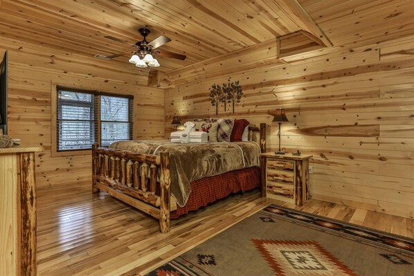 King master bedroom on the terrace level with 55" Flat-Screen TV and a private bathroom with tub/shower combo