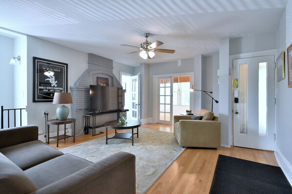 This House was built in 1902 and was modified into 2 apartments in the 1940's. The house has 3 levels and many stairs. It has quirks and oddities but is prefect for large groups. This house can comfortably sleep a total of 12 people. This home is a unique opportunity for 2 family's traveling together or a group of 8 adults traveling for business or pleasure. Each bedroom has only 1 bed. Each floor has a full bathroom for a total of 3. You will be renting the entire house which includes 2 separate apartments. The upstairs unit comfortably sleeps 5. There is a 3 bedrooms unit upstairs with the King bed, its own kitchen, bathroom and laundry. The first floor unit comfortably sleeps 7. The first floor unit has 4 bedrooms, a kitchen and bathroom on the first floor. One of the bedrooms on the first floor is tiny. The basement has the main suite with a Queen bed. Also the full bathroom down stairs has a heated floor. Full size laundry machines downstairs as well. This house has a lot of stairs and there is a spiral stair case in the living room that gets you down to the basement bedroom. Both units have a back deck for that morning cup of Joe. Fully fenced in backyard for the kids to safely play. Both kitchens fully stocked. Plenty of towels. I live close by and respond to all questions immediately. This house is close to the expressway, you can be downtown Chicago in 15 minutes with no traffic. Walking distance to Blue Line or the Green Line. Grocery stores, restaurant's, and drug stores in close proximity. Dunkin Donut's 1 block away. ONLY TWO PARKING SPACE INCLUDED.