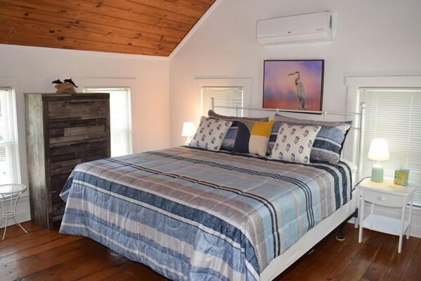 The second floor features a bedroom with a king bed, providing a peaceful retreat with ample privacy.