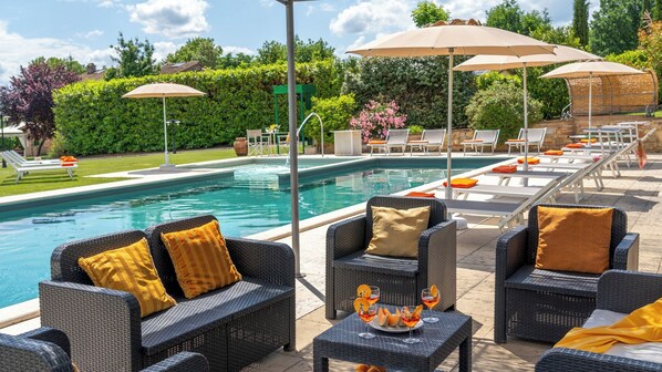 Allas sijaitsee puistossa, näkyvissä talon ja tarjoaa upeat näkymät, upotetaan koska se on vihreys. Se saavutetaan rajan puiston talosta tai muuten laskeutumalla kiviportaat vieressä pääportin. Suorakaiteen muotoinen, se mittaa 16 x 8 m syvyyteen vaihtelee 0,90 metristä 1,80 m, se on vuorattu kloorikautsu- maali ja veden saatavuus on Roman vaiheita. Vuonna matala osassa allas on mahdollista luoda lasten alue sulkemalla pois tämä alue net. On poreallas tuuletusaukkojen, ulkoista ja sisäistä valaistusta ja klooria puhdistus kasvi. Solarium alasta on travertiini ja nurmikon ja on varustettu solariumit, pieniä pöytiä, sateenvarjot, tuolit, nojatuolit ja ulkona suihku, lämmin ja kylmä vesi.