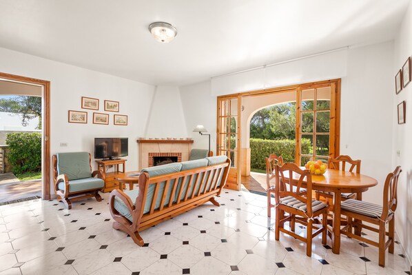 The interior of the house, on one floor, has a simple style designed to offer you the rest you deserve. The living-dining room has a TV, which makes it perfect to extend your evenings. The kitchen is independent and is equipped with ceramic hob and all the necessary utensils for you to cook comfortably. In the house there is a washing machine, iron and ironing board. There are three bedrooms to rest in. One of them has two single beds, another one has a double bed and the third one has a single bed. There is a bathroom with a shower. There are four fans and a radiator at your disposal. If you are travelling with your baby, we can provide you with a cot and a highchair.
