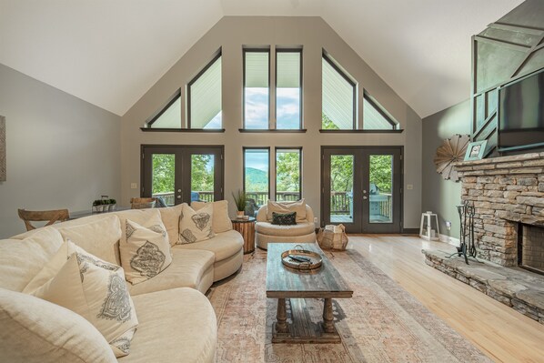 ✔ Soaring windows in the living area, wood-burning fireplace, TV