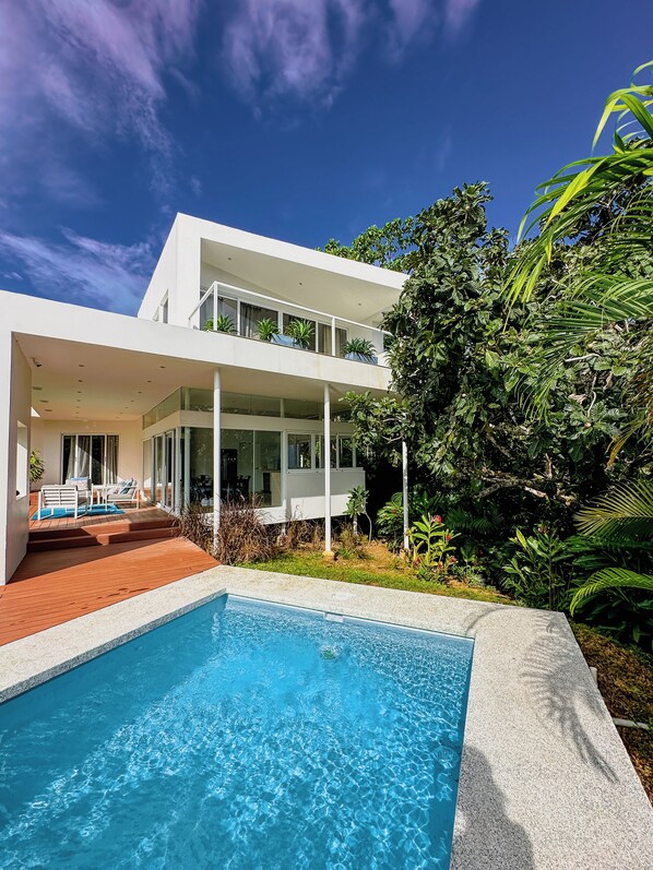 Nestled just a few minutes away from the charming seaside town of Montezuma, on Costa Rica's southeastern side of the Nicoya peninsula. Casa C*antini offers the perfect blend of tranquility and adventure. Surrounded by lush jungle in an exclusive and peaceful residential area, this stunning retreat is close to pristine beaches, exquisite restaurants and a wide array of activities, from surfing to hiking. Designed with sustainability in mind, this modern home harmonizes beautifully with its natural surroundings. Casa C*antini features a spacious layout with three bedrooms, two bathrooms, a private pool and breathtaking ocean views. Occupancy: accommodates up to 7 people. Family-Friendly: Children are warmly welcomed. Experience the ultimate Costa Rican getaway at Casa C*antini, where nature meets refined comfort. Ground floor: Upon entry into the house, you are welcomed by a generous living room with immediate views spanning out into the garden and pool area through glass doors. The ground floor layout of the villa is generous with 2 bedrooms off to one wing with a shared full bathroom, a large modern kitchen that literally extends over the terrain and gives a sensation that the room is hanging in the air and embraced by jungle, a complete wall of sliding glass doors in the kitchen that open up to a covered deck that meets with the rest of the house and to the pool. Second floor: A large master suite upstairs with its own in-suite bathroom, as well as, a look-out terrace large enough for practicing yoga or spacious enough as a place to sit and enjoy jungle and ocean views. Upstairs you can enjoy a beautiful ocean view spanning southeast out onto the Pacific Ocean
