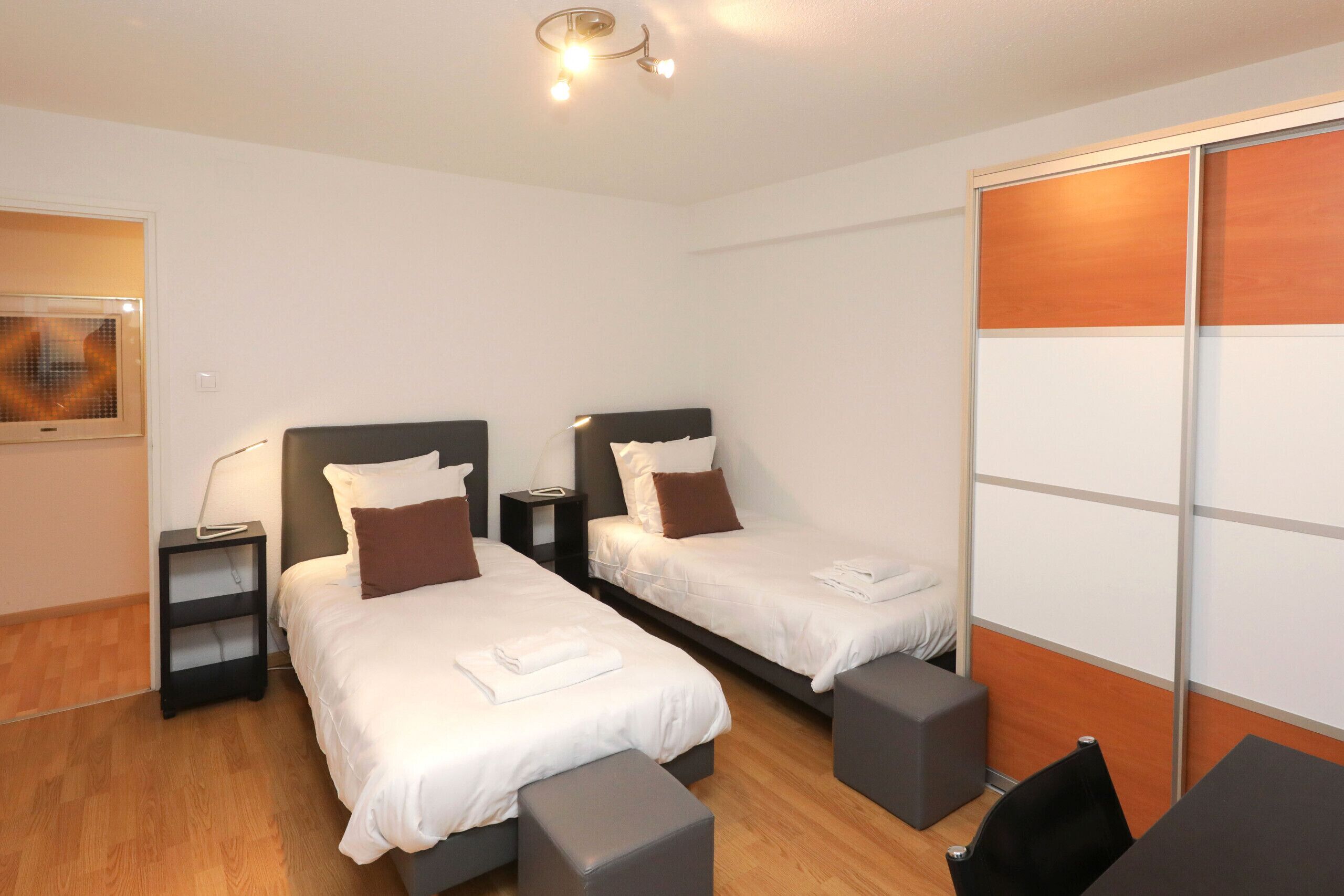 a bedroom with two single beds, with access to a long balcony,