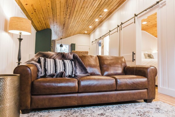 The kitchen, with brand-new stainless steel appliances—including a gas stove—has absolutely everything you need to make a full meal, even a waffle maker and pancake griddle for your Sunday morning brunching pleasure. You’ll find the bathroom bright and peaceful, a perfect place to read the morning news and rinse off your post-hike sweat.