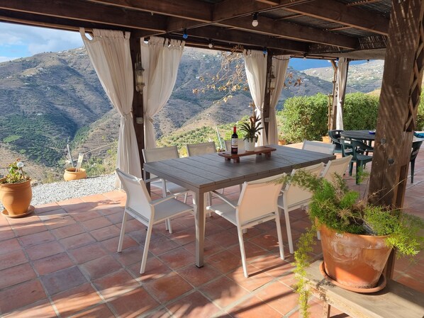 The holiday home Casa Havana is located in the foothills of Andalucía and close to the picturesque village of Competa and boasts beautiful views of the mountains down to the sea, The holiday home consists of a cosy living room with a rustic fireplace, a very well-equipped kitchen with a dishwasher, 4 bedrooms (1 with Double Bed, two with 2 Single Beds each and one with one Single Bed) as well as two bathrooms and can therefore accommodate 7 people. Additional amenities include Wi-Fi, air conditioning and a washing machine. A highchair and a baby cot are also available upon request. One of the main attractions of the house is its private outdoor area, which consists of a lush garden with garden furniture and sun loungers, a covered terrace with chairs, a outdoor barbecue area where you can prepare delicious dishes and a generous pool where guests can cool off on warm summer days. You will find a wide selection of shops, restaurants, bars and cafes in the local village of Competa just 10 minutes away by car (5km), while the closest beach on Torrox Costa can be reached after a 20-minute drive (16km). The charming city of Málaga, birthplace of the famous painter Pablo Picasso, is 45 minutes driving away (45km), while the closest airport can be reached after 48 minutes driving (50km). Private parking is available on the property. Bed linens and towels are included in the price.