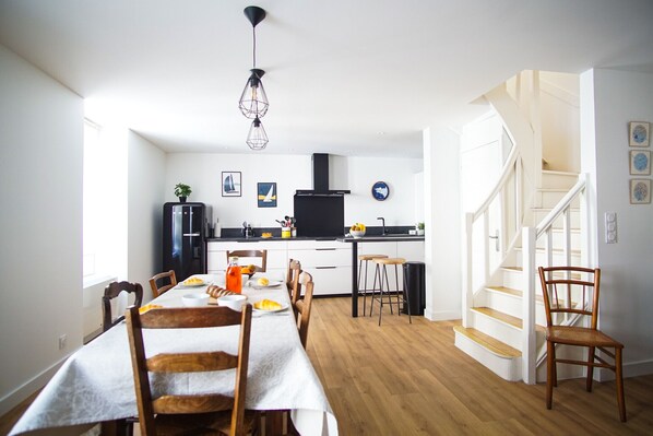 Then take the pretty staircase and discover, the large living room, the heart of this house. On one side, a comfortable living room awaits you, followed by the dining room open to a modern and very well-equipped kitchen (filter coffee maker).